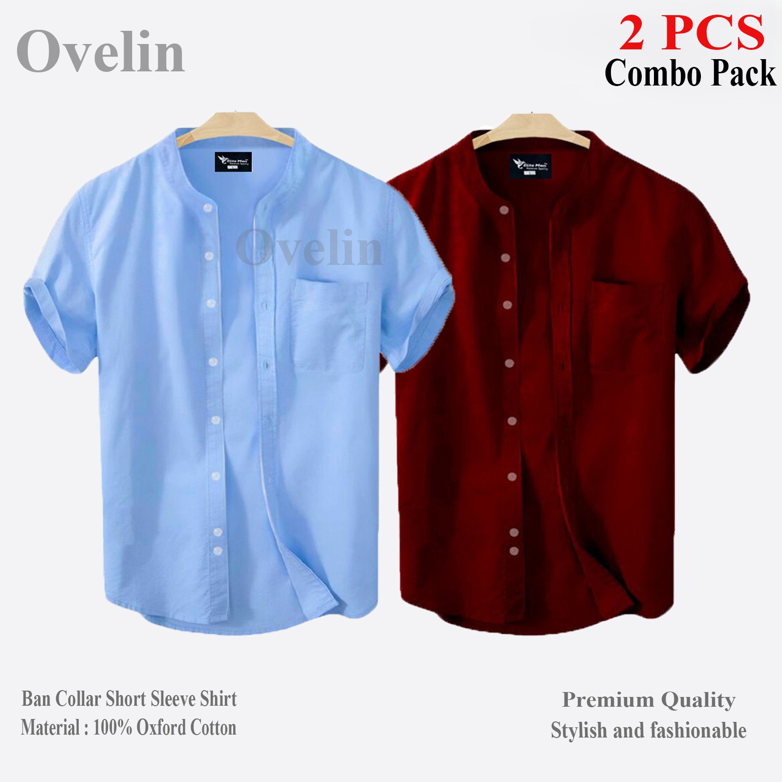2 pcs Combo Ban Colar Short Sleeve Shirt - Maroon & Sky Blue. - 1491