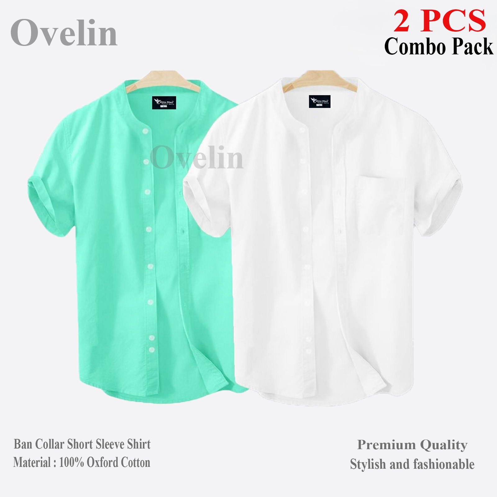 2 pcs Combo Ban Colar Short Sleeve Shirt - White & Pest. - 1474