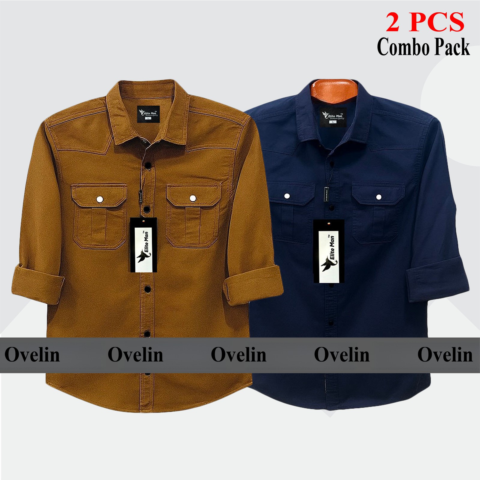 2 Pcs Combo Premium Quality Double Pocket Shirt - Banson & Navy Blue. - 1564