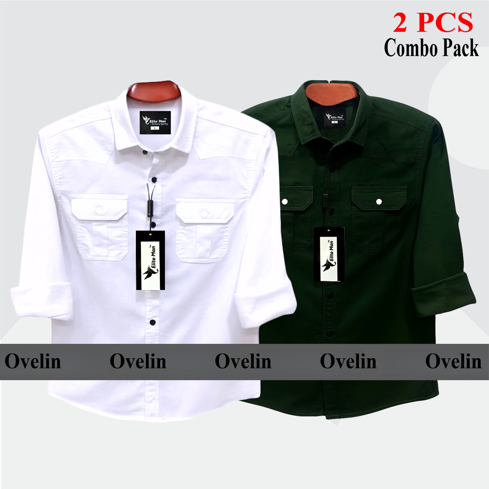 2 Pcs Combo Premium Quality Double Pocket Shirt - White & Green. - 1561