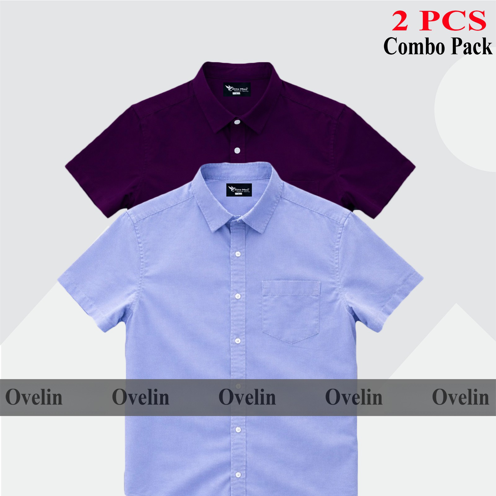 2 Pcs Combo Short Sleeve Shirt - Purple & Sky Blue. - 1347