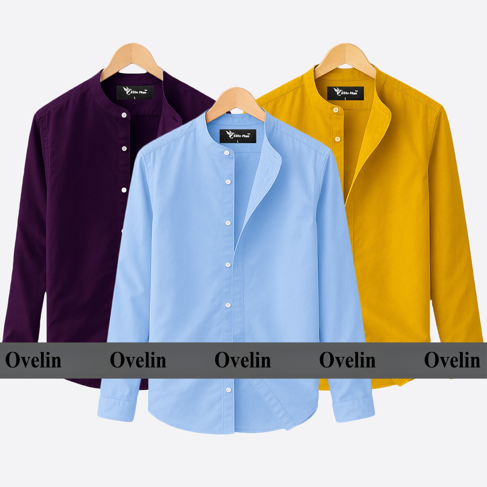 3 pcs Combo Ban Colar Full Sleeve Shirt - Purple, Kathali & Sky Blue. - 1269