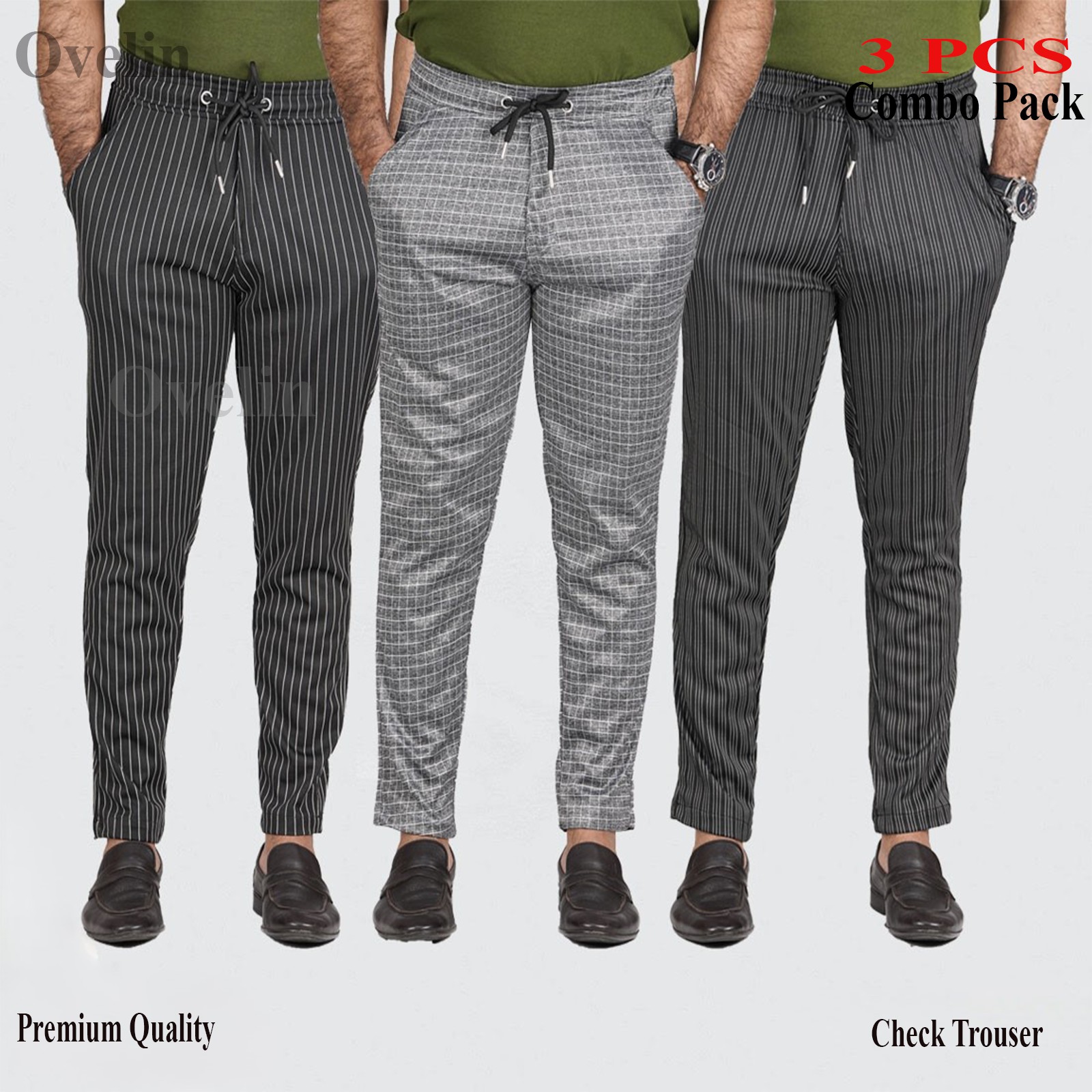 3 pcs Combo Check Trouser's- Black Big Stripe, Black Small Stripe & Ash Stripe. - 1537