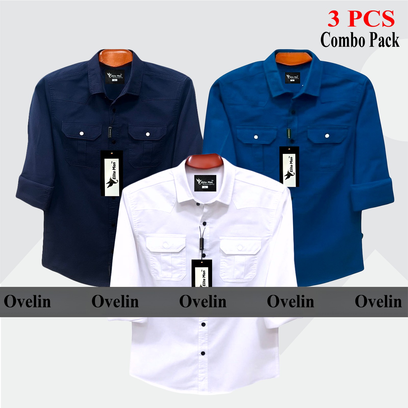 3 Pcs Combo Premium Quality Double Pocket Shirt - White, Navy Blue & Royal Blue. - 1582