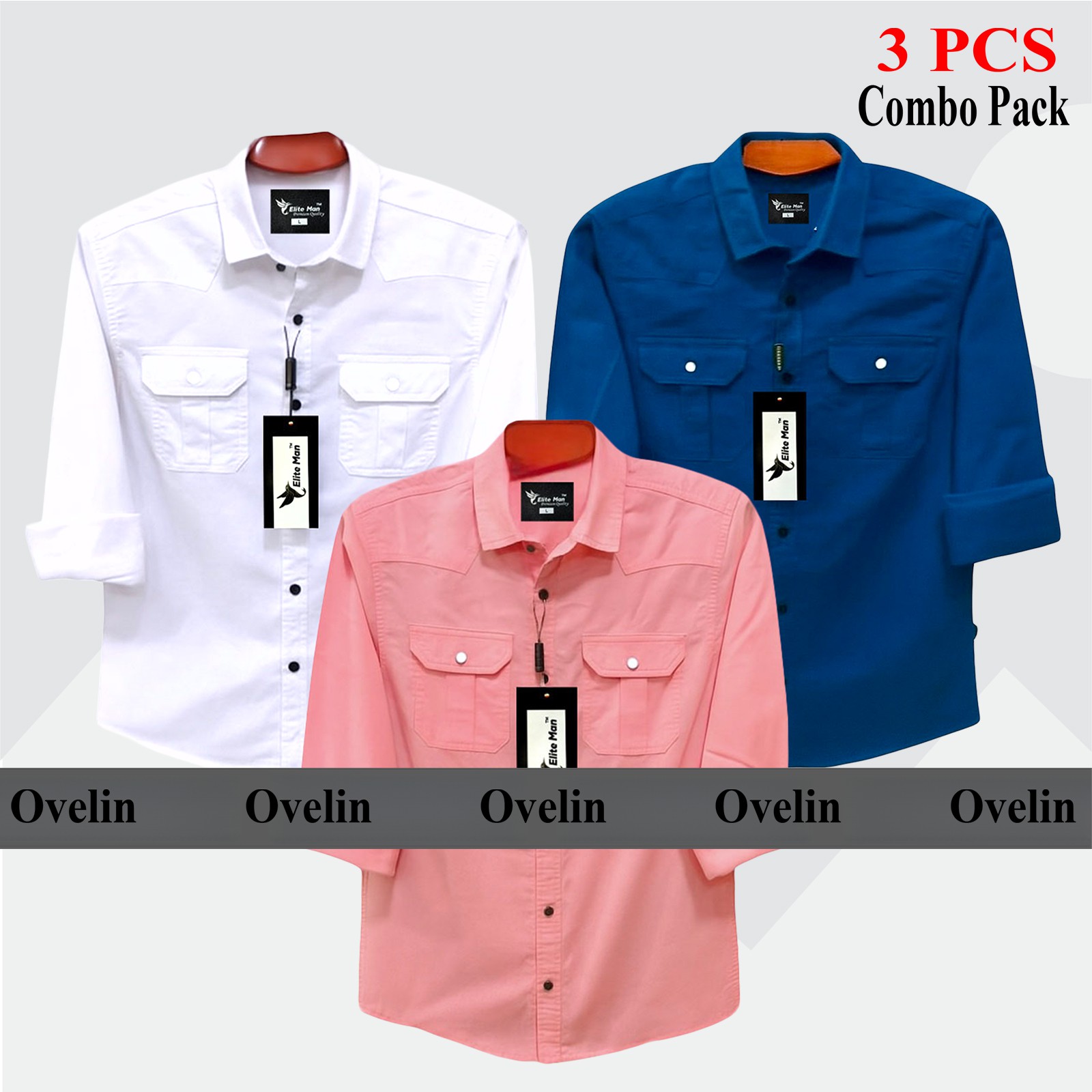 3 Pcs Combo Premium Quality Double Pocket Shirt - White, Pink & Royal Blue. - 1585