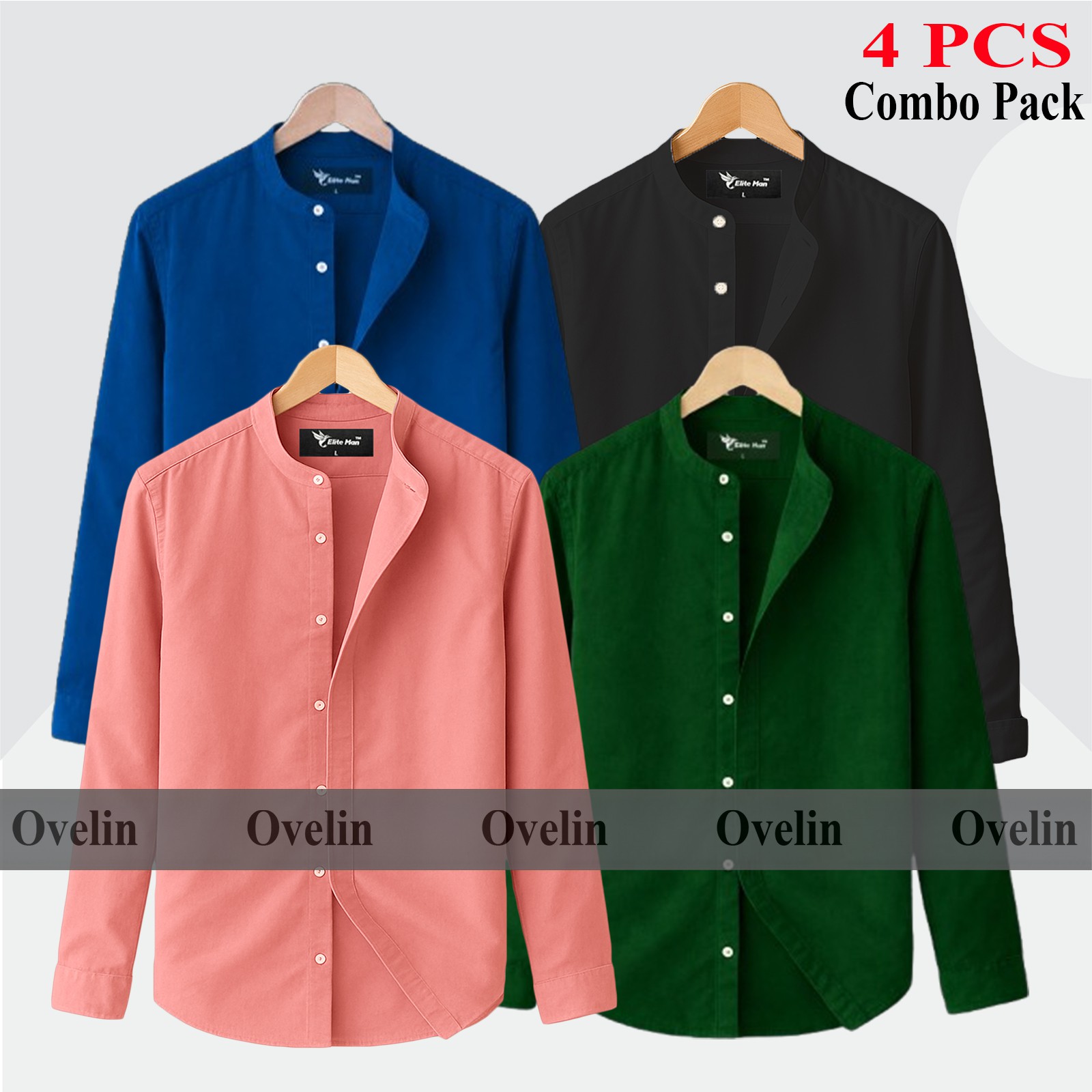 4 pcs Combo Ban Colar Full Sleeve Shirt - Black, Green, Teal & Pink. - 1647