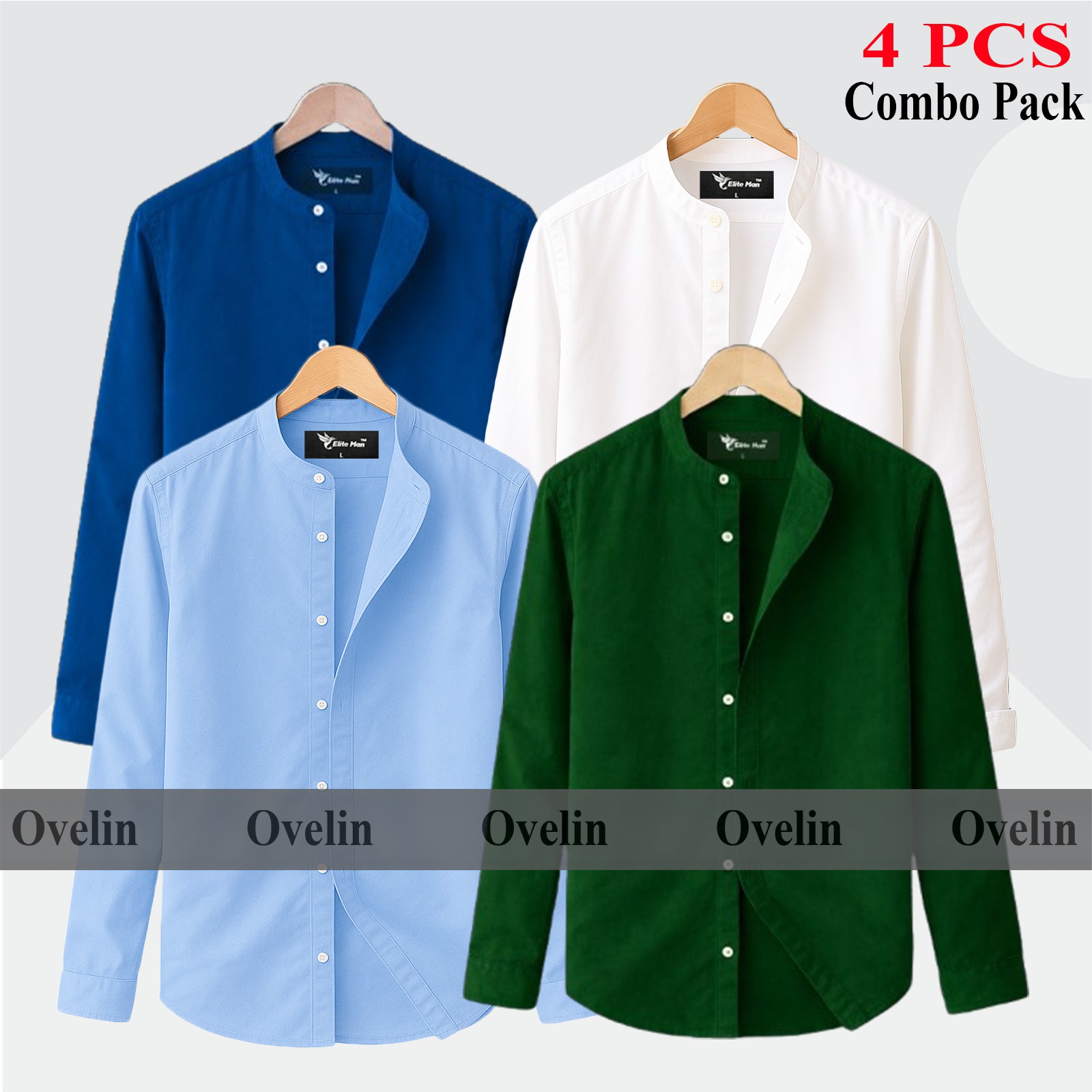 4 pcs Combo Ban Colar Full Sleeve Shirt - Black, White, Pest & Sky Blue.