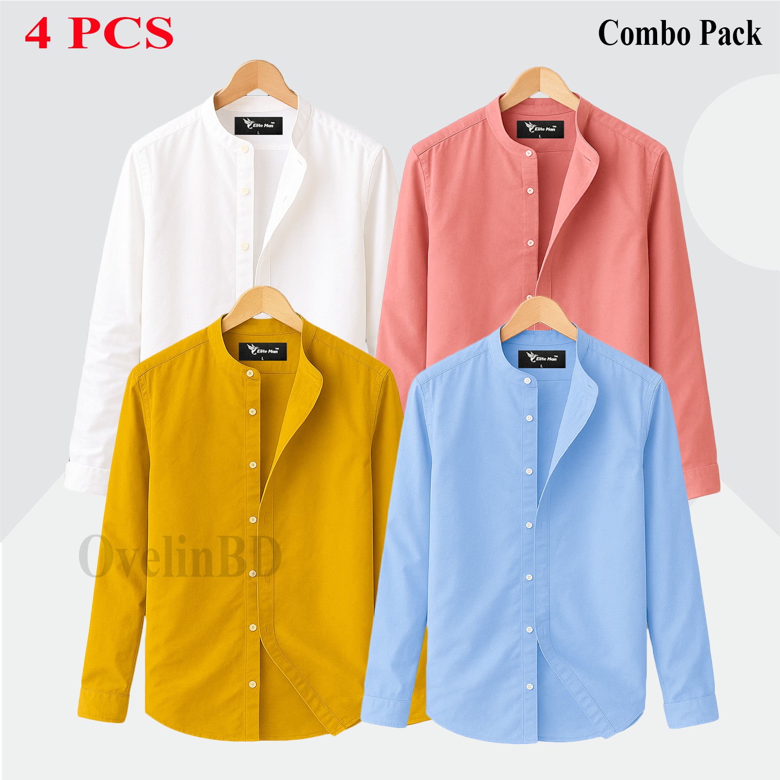 4 pcs Combo Ban Colar Full Sleeve Shirt - White, Pink, Kathali & Sky Blue. - 1642