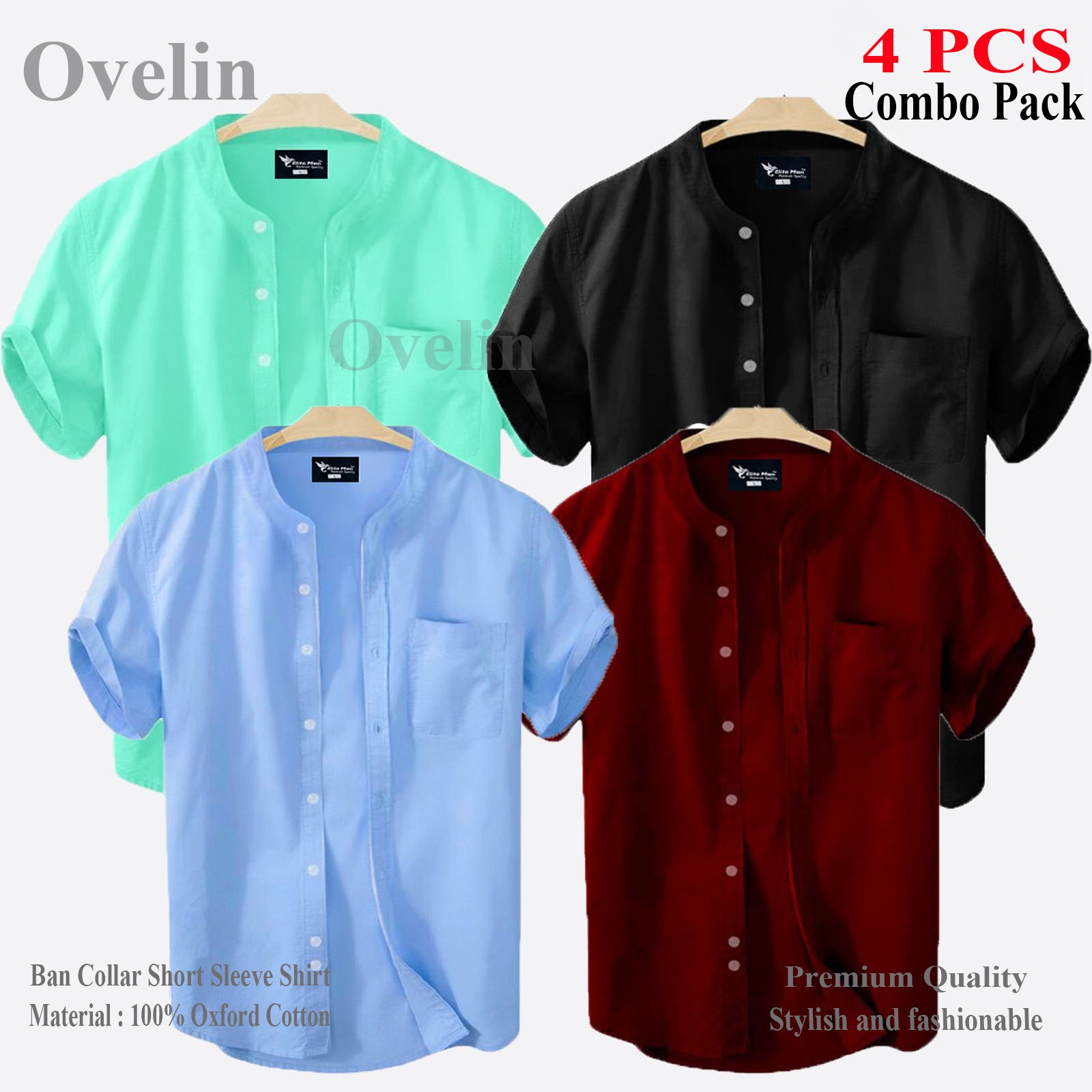 4 pcs Combo Ban Colar Short Sleeve Shirt - Black, Ash, Pest & Sky Blue.