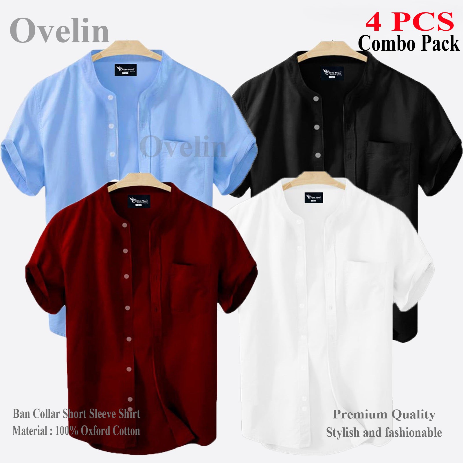 4 pcs Combo Ban Colar Short Sleeve Shirt - Black, White, Ash & Sky Blue.