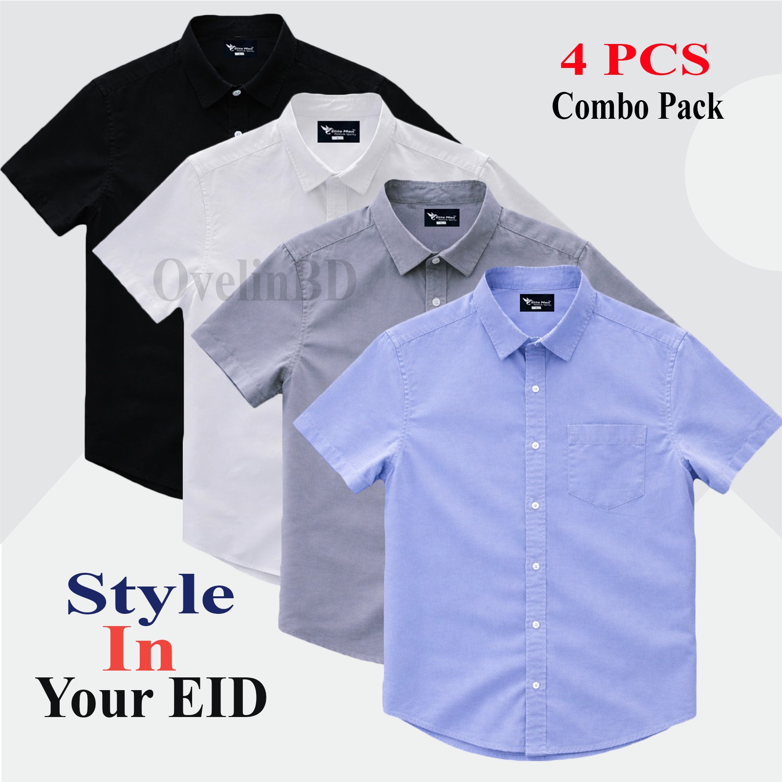 4 Pcs Combo Short Sleeve Shirt - Black, White, Ash & Sky Blue. - 1073